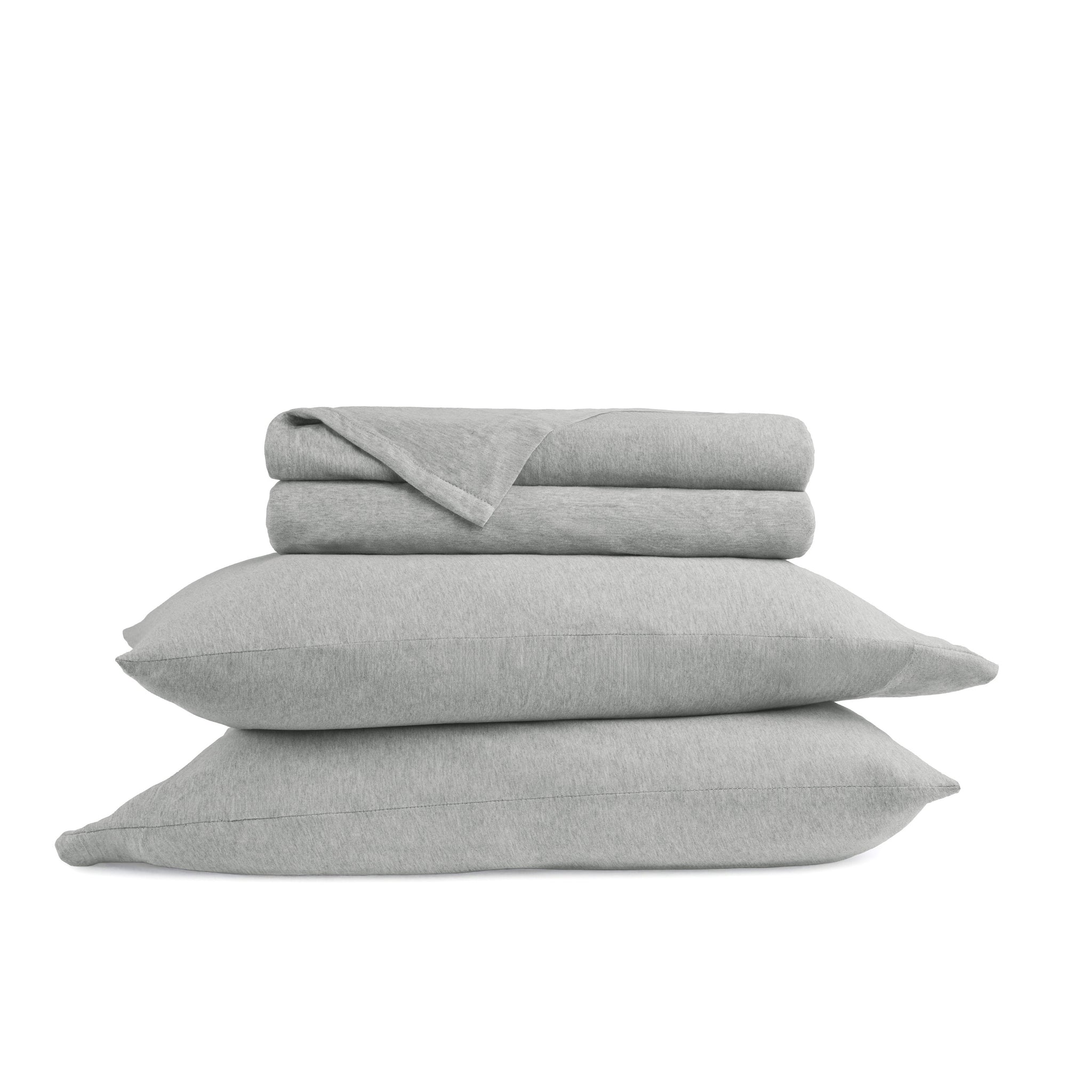 Enhance your sleeping experience with our ultra-soft and comfortable Jersey Knit Sheet Set, available in a range of soothing colors. Made from 100% Cotton, these sheets are exceptionally soft and breathable, providing the perfect blend of warmth and comfort, ideal for year-round use. The jersey fabric offers a cozy, four-way stretch, like your favorite super soft t-shirt! With its durable and stretchy nature, this sheet set ensures a snug fit on your mattress and delivers a restful night's sleep in luxurious comfort.